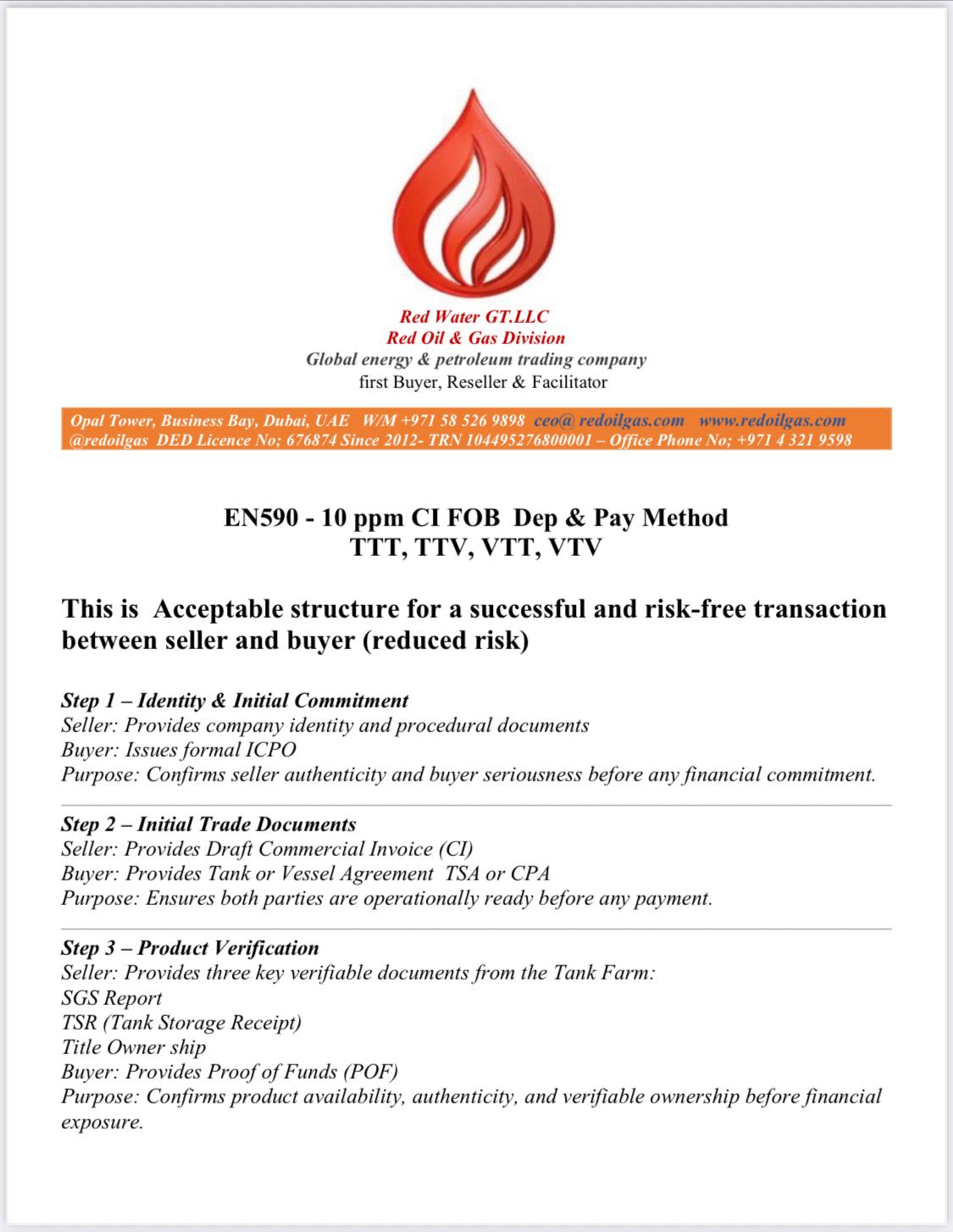 Red Oil & Gas Co. is a trusted First Buyer, Resaler, Mandate, Facilitator & Broker in the fields of: EN590 (10 PPM), D2 (5000 PPM), SN500, D6, Mazut, LNG, LPG & more. With years of global market experience, we have established ourselves as a reliable partner for clients worldwide. Our core expertise lies in facilitate premium energy products Through our extensive network of reputable facilitate and direct partnerships with leading refineries, we deliver competitive pricing and exceptional service.Also we provide buyers with expert consulting, deal facilitation, market analysis, negotiation support, and assistance in preparing all necessary documentation for successful procurement.